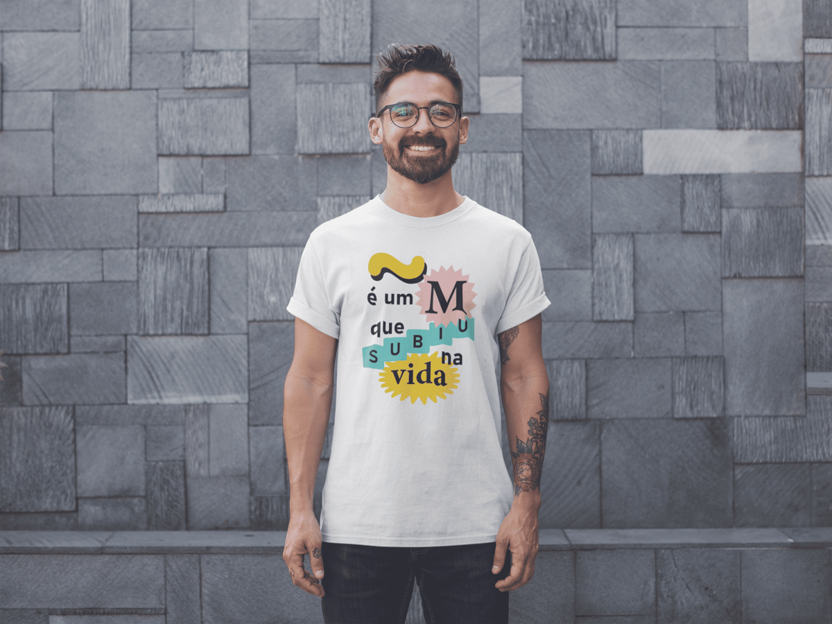 A camiseta masculina da coleção Curiosidades: ~ é um m que subiu na vida celebra e brinca com uma das particularidades mais queridas da língua portuguesa: o uso do til (~)!